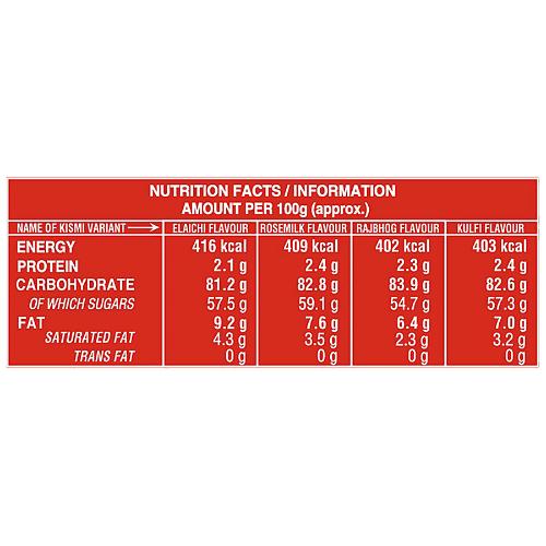 Parle Kismi Toffee contains elaichi (cardamom) and toffee caramel which are good for antioxidant and Diuretic Properties May Lower Blood Pressure,Contain Cancer-Fighting Compounds,Treat Bad Breath.