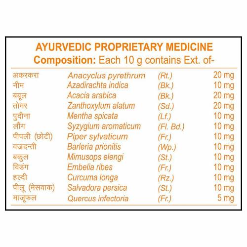 Lavang Tomar Akarkara Babool Triphla Khadir Pudina sat Ajwain sat Kapoor sat Neem vajradanti Meswak Anar chilka.