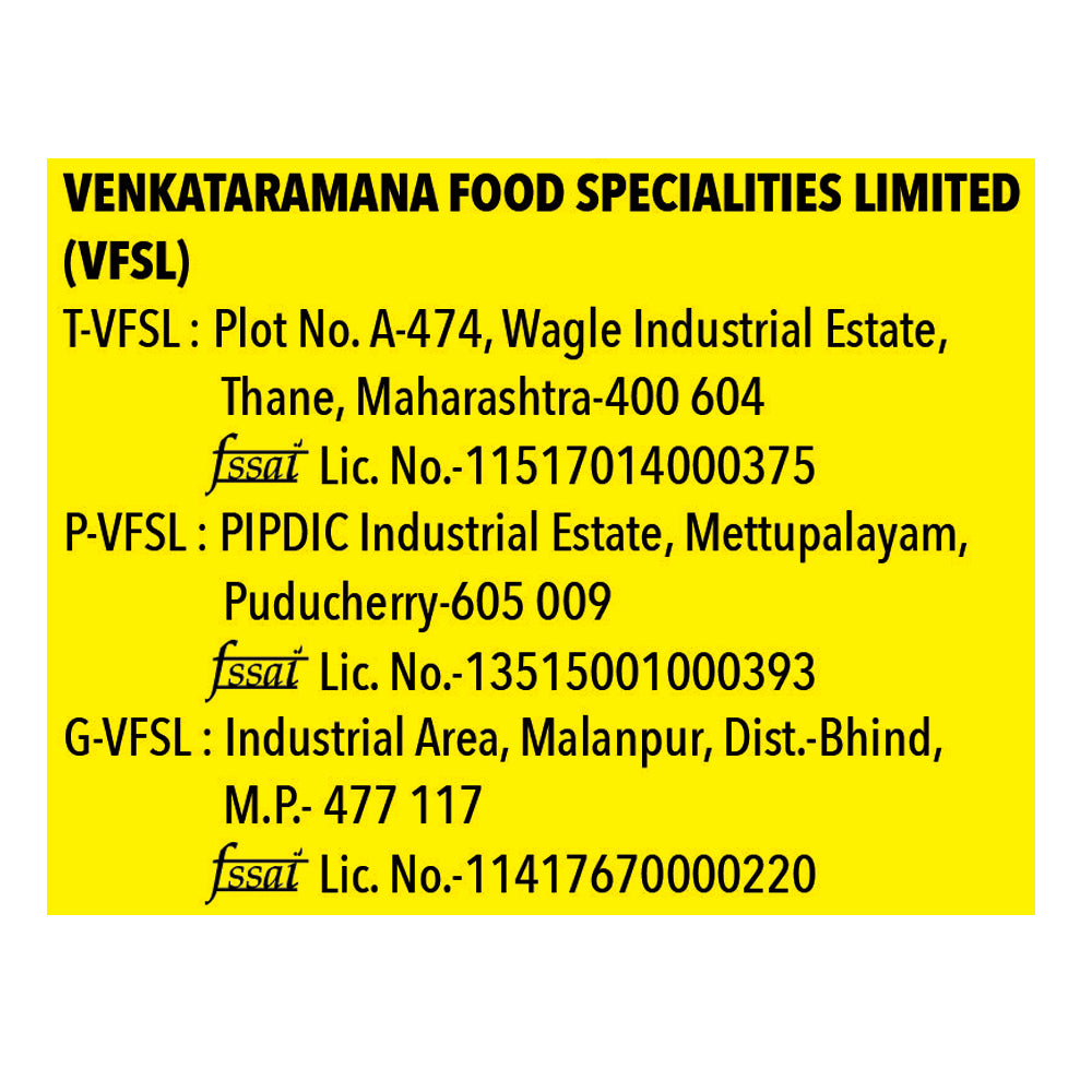 Name and Complete Address of the Manufacturer: Venkataramana Food Specialities Ltd,Plot No.A-474,Road No.34,Wagle Indl Estate,Thane-400604(MAH) Fssai No-11517014000375,11417670000220, 13515001000393,13318009000044,11217302000389,12419008000856