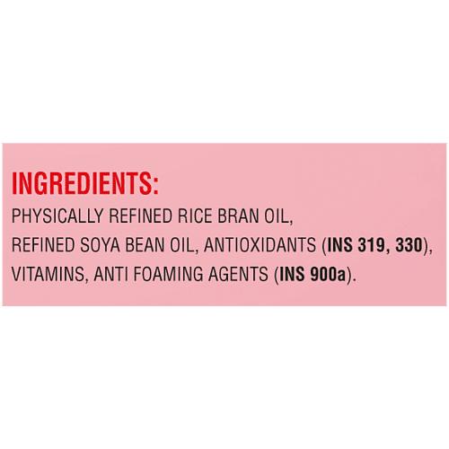 Refined Rice Bran Oil And Refined Soya Bean Oil. Contains Permitted Antioxidants [319, 330] And Anti Foaming Agent |900a|Contains Vitamin E: 250ppt. Free From Argemone Oil. Fortified With Vitamins A And D.