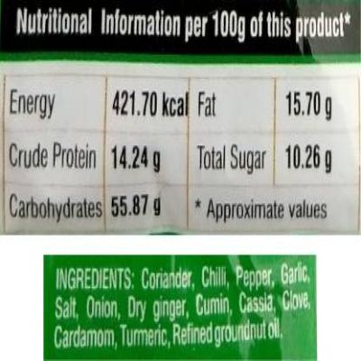 Red Chili, Paprika, Salt, Coriander, Turmeric, Cumin, Ginger, Garlic, Green Cardamom, Black Pepper, Brown Cardamom, Cinnamon, Black Cumin, Clove, Fenugreek Seed, Nigella, Carom, Acid: Citric Acid, Maltodextrin, Hydrolysed Soy Protein, Cane Sugar, Canola Oil, Anticaking Agent: Silicon Dioxide Allergy Advice: May contain traces of Sulphite, Sesame, Mustard, Gluten and Tree Nuts