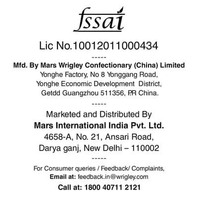 Name and Complete Address of the Manufacturer: Mars Wrigley Confectionary (China) Limited Yonghe Factory, No 8 Yonggang Road, Yonghe Economic Development District, Getdd Guangzhou 511356, P.R China. Fssai No:- 10012011000434