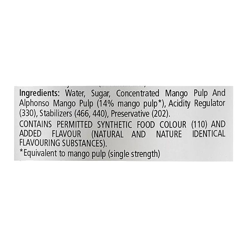 Water, Sugar, Concentrated Mango Pulp and Alphonso Mango Pulp (13.6%* Mango Pulp), Acidity Regulator (330), Stabilizer (440), Preservative (202), Antioxidant (300). CONTAINS PERMITTED SYNTHETIC FOOD COLOURS (102, 110)