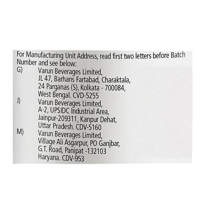 Name and Complete Address of the Manufacturer: Varun Beverages Limited, Village Ali Asgarpur, PO Ganjbar, G.T. Road, Panipat - 132103, Haryana CVD-953 Fssai No:-10014064000435