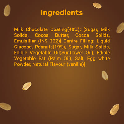 Milk Chocolate Coating(40%): [Sugar, Milk Solids, Cocoa Butter, Cocoa Solids, Emulsifier (INS 322)] Centre Filling: Liquid Glucose, Peanuts(19%), Sugar, Milk Solids, Edible Vegetable Oil (Sunflower Oil), Edible Vegetable Fat (Palm Oil), Salt, Egg white Powder, Natural Flavour (vanilla)].
