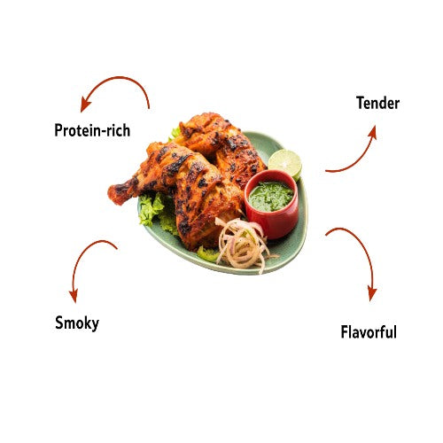 Enjoy A Plate Full Of Juicy And Tender Tandoori Chicken Which Have Been Hygienically Packed. You Can Savour These Chicken With Mayonnaise Or Green Chutney And Lime.