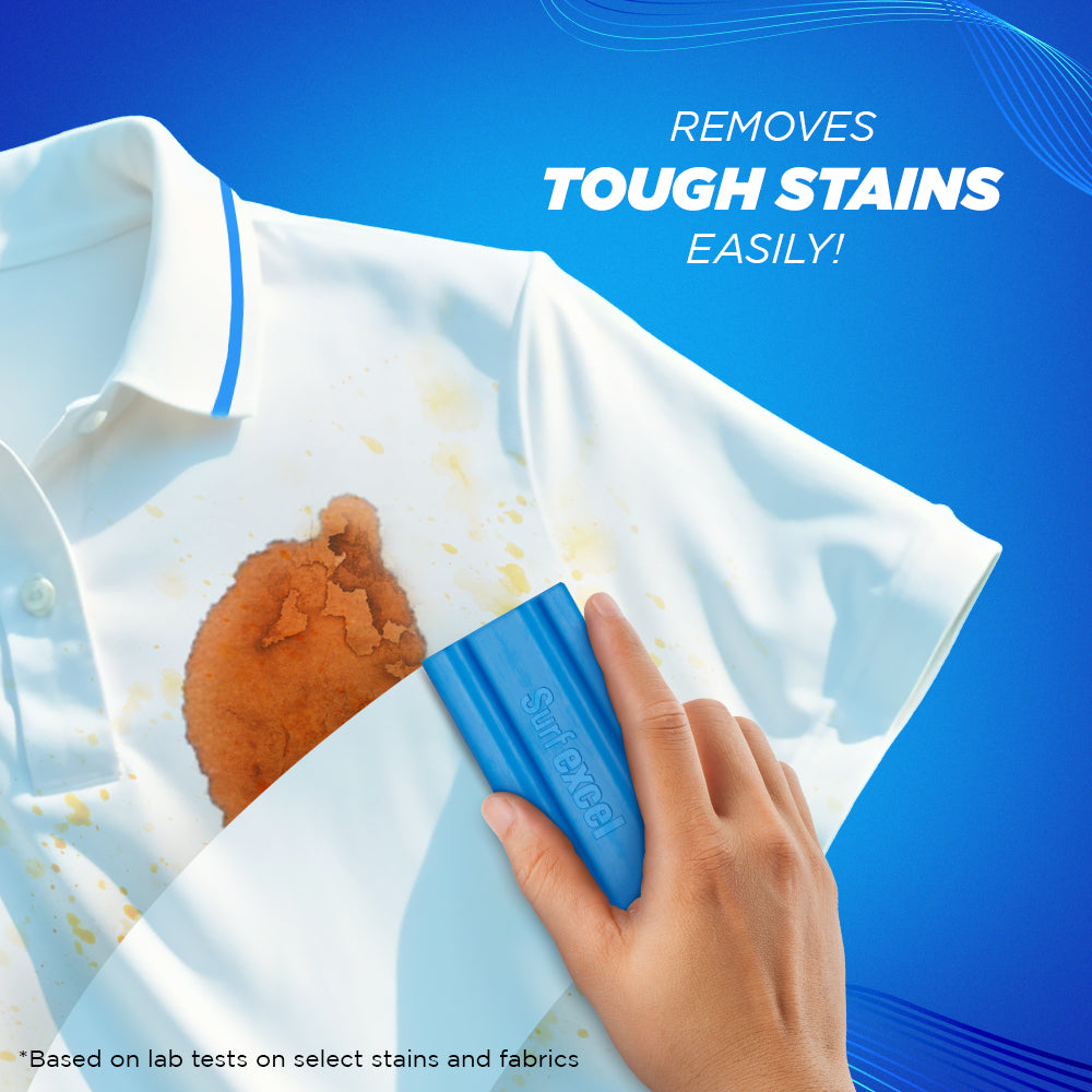 India's most premium detergent bar,You’re personal 'Stain Eraser’: Removes tough stains with ease.Surf Excel Bar combines the cleaning benefits similar to that of vinegar, blue, bleach, and lemon.Removes tough stains such as tea, coffee, turmeric, curry, ketchup and chocolate with just one productGentle on both your clothes and your handMakes your laundry easy