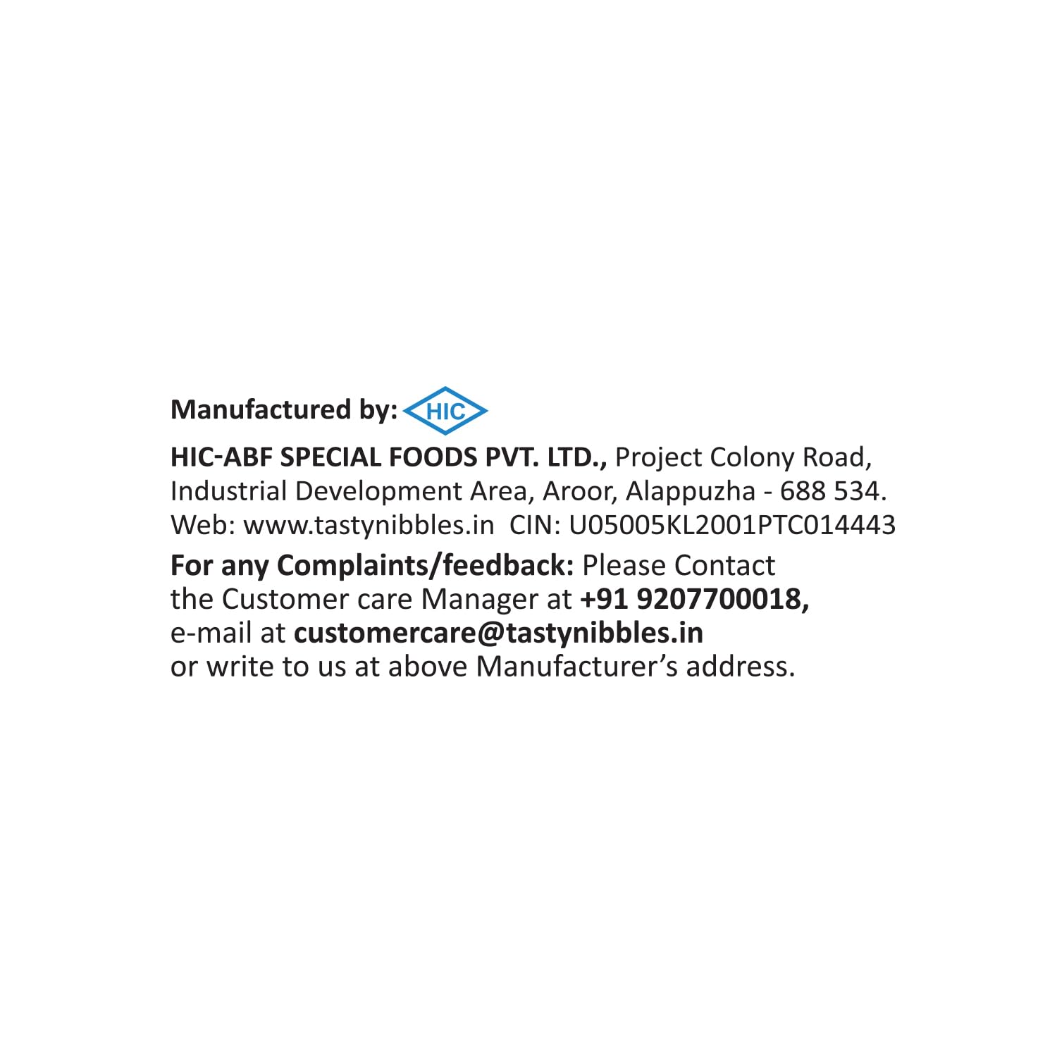 Name and Complete Address of the Manufacturer: HIC-ABF Special Foods Pvt Ltd,Project Colony Road, Industrial Development Area,Aroor, Alappuzha District, Kerala, India. PIN-688 534, Fssai No.FSSAI Number: 10013041000294