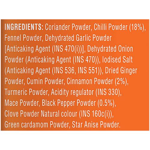 Coriander, Chilli, Fennel, Salt, Dehydrated Onion , Garlic, Ginger Powder, Cumin, Cinnamon, Turmeric Mace, Cloves, Black Pepper, Cardamom, Star-anise.