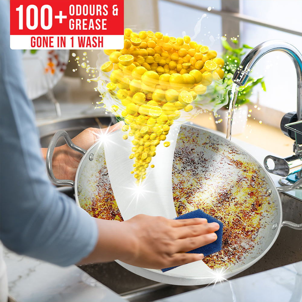Step 1. Take 1 teaspoon (3.75 ml) of Vim gelStep 2. Mix it in 1 (40 ml) bowl of water Step 3. For cooking vessels, use the green side of the sponge scrubber and for dishes, tiffins, other utensils use the yellow side of the scrubber by dipping them in the mixtureStep 4. Clean to get a sink full of refreshingly fragrant and sparkling vessels