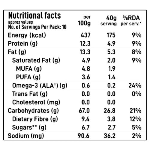 Whole Grains (Rolled oats 26%. Brown rice flakes 24%). Seeds (Quinoa 8%. Pumpkin. Chia 2% & Flax 2%). Dried Fruits (Raisins. Dried Cranberries 5%). Belgian Dark Chocolate 12% (Cocoa. Cocoa Butter. Sugar. Soy lecithin), Date Syrup. Almonds 4%. Soy Protein Flakes. Jaggery. Rice Bran Oil. Cocoa powder. Himalayan Pink Salt