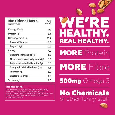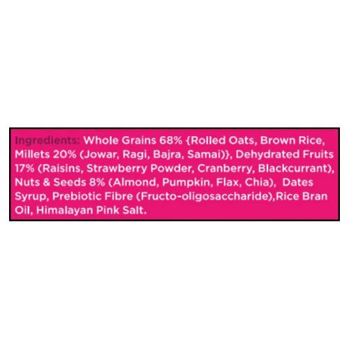 Whole Grains 50% (Rolled oats. Brown rice flakes). Dried Fruit 22% (Raisins. Cranberries. Apricots. Blackcurrants). Seeds 18% (Quinoa. Pumpkin. Chia. Flax). Almonds. Soy protein flakes. Jaggery. Rice bran oil. Himalayan Pink Salt
