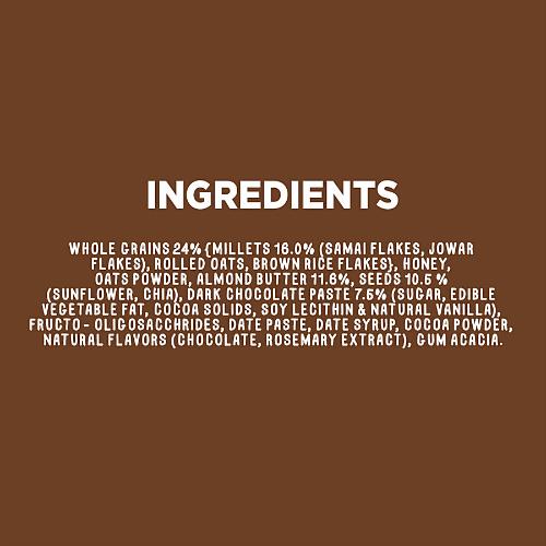 Whole Grains 26% (Brown rice, Millets (Saamai, Foxtail), Rolled Oats 15%), Honey 20%, Almonds 12%, Dates, Seeds 9% (Sunflower, Chia (3%)), Rice crispies, Belgian Dark Chocolate 6% (Cocoa, Brown Sugar, Cocoa butter, Soya lecithin), Peanut protein powder. CONTAINS ADDED NATURAL FLAVOUR(Rosemary Extract, Vanilla Extract).