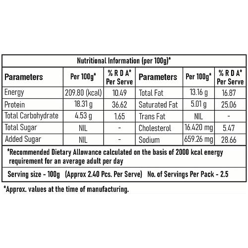 Chicken Meat (77%), Onion, Herbs, Chana Dal Powder,Eggs, Isolated Soya Protein, Green Chilli, Garlic, Common Salt. Ginger. Mixture of Spices and Condiments.