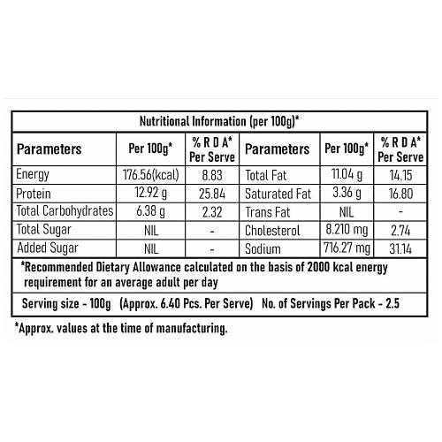 Chicken Meat (58%), Water, Corn Starch. Isolated Soya Protein, Mustard Oil, Mixtufe of Spice‘ & Condiments, Garlic, Green Chillies, Coriander Leaves, Yeast Extraot powder, Iodized Salt, • SOdium Nitrite - INS 250.