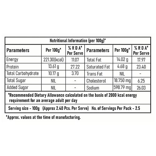 Chicken Meat (62%), Water, Starch, Isolated Soya Protein, Curd, Common Salf, Garlic, Mixture of Spices and Condiments, Green Chilli, Egg, Mustard Oil. Dry Coconut Powder, Ginger, Texturizer (E451). Anti Oxidant (E316), Preservative (E250), Anti Caking Agent (E500).